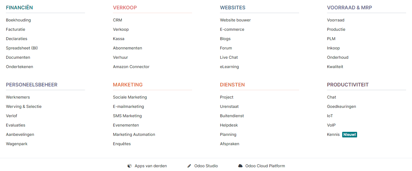 Het Odoo-platform is modulair opgebouwd, met diverse componenten die elk specifieke functionaliteiten bieden. Deze opbouw stelt ons in staat om Odoo volledig aan te passen aan jouw specifieke behoeften, door alleen de benodigde modules te implementeren. Of het nu gaat om het beheren van verkoop en marketing, het automatiseren van HR-processen, of het optimaliseren van logistiek en voorraadbeheer, Odoo biedt passende modules. Bovendien kan de oplossing meegroeien met je bedrijf: nieuwe apps kunnen eenvoudig worden toegevoegd naarmate je organisatie zich ontwikkelt of nieuwe eisen ontstaan, wat de schaalbaarheid en flexibiliteit benadrukt.